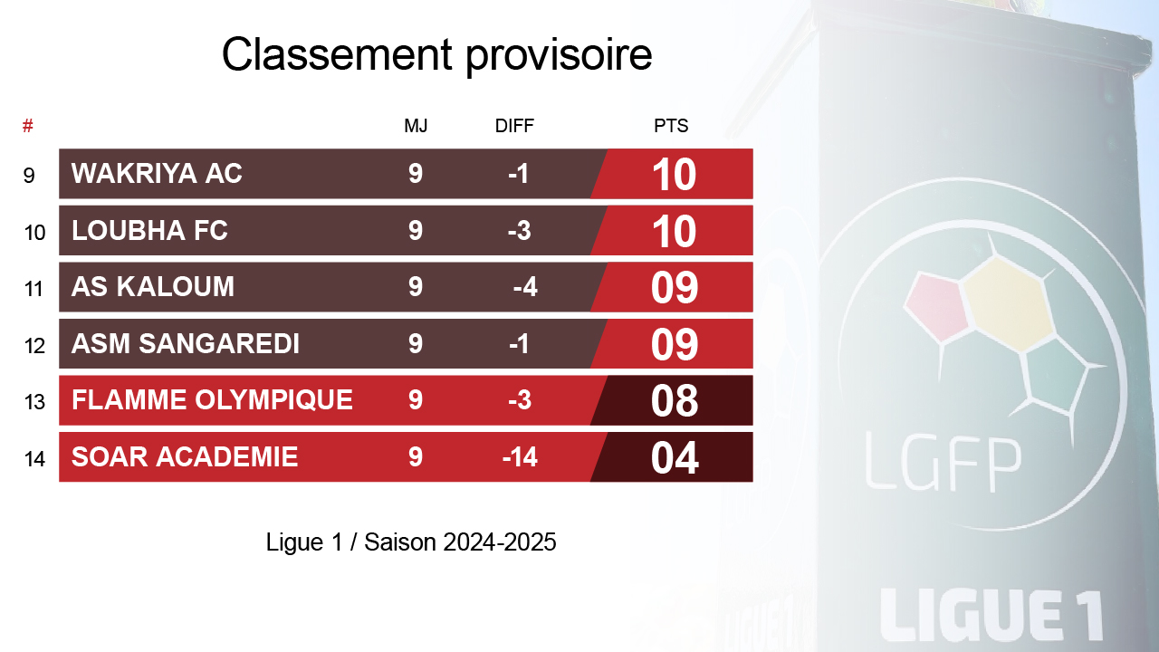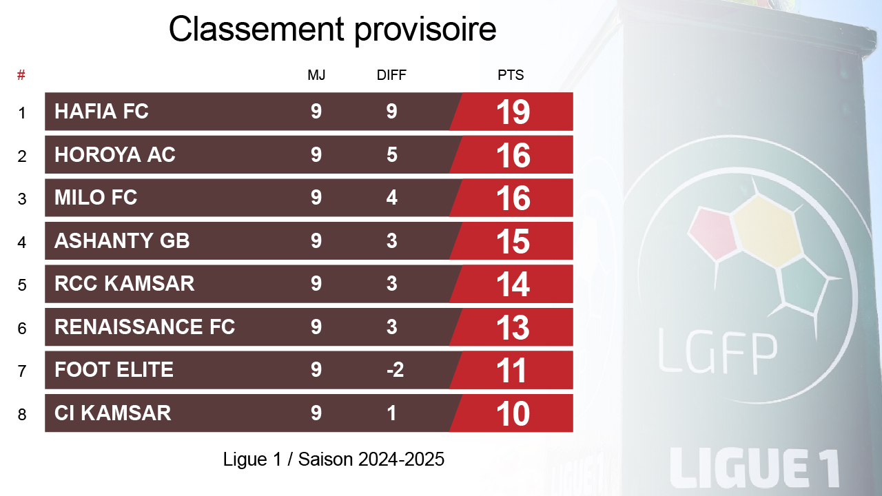 Au classement, le Hafia conserve sa première place avec désormais 19 points, suivi du Horoya AC, malgré sa défaite, occupe la deuxième place avec 16 points. Même nombre de points pour le Milo qui se positionne à la 3e place. La lanterne rouge est occupée par la Flamme Olympique et l’Académie Soar malgré sa victoire.