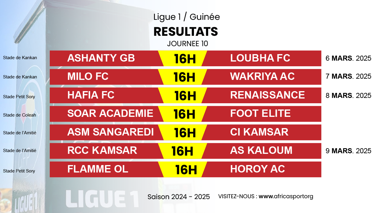 La 10e journée qui démarre le 6 mars réserve beaucoup de belles rencontres. Opposés en finale de la deuxième édition de la coupe de la Ligue avec une victoire pour le Hafia FC, les vert et blanc recevront la Renaissance FC au stade Petit Sory. Le stade de l’Amitié de Kamsar accueillera un autre derby de kakandé entre l’ASM Sangarédi et le Wakriya AC. A Kankan, la SAG tentera de se relever de sa défaite de son précédent match, face au Loubha FC.