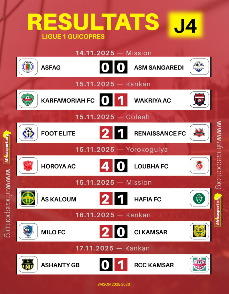 La Renaissance Caïman Club a décroché une précieuse victoire face à l’Ashanti Golden Boys de Siguiri (1-0) en clôture de la 4ᵉ journée du championnat de Ligue 1 Guicopres, ce lundi 17 novembre 2025 au stade M’Balou Mady Glao de Kankan.